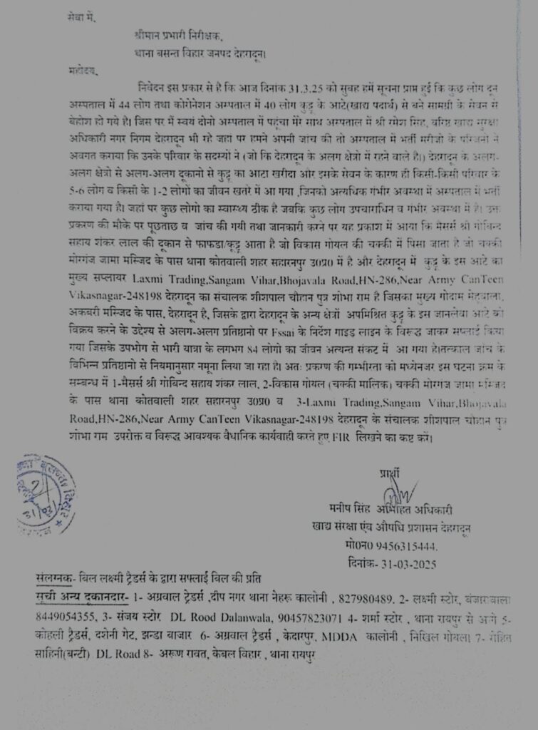 3. Laxmi Trading, Sangam Vihar, Bhojwala Road, Vikasnagar, Dehradun – यह प्रतिष्ठान देहरादून में कुट्टू के आटे का मुख्य वितरक था। इसका गोदाम मेट्याला अकबरी मस्जिद, देहरादून के पास स्थित है।