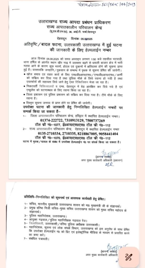 उत्तरकाशी जिला प्रशासन और राज्य सरकार ने जारी किए आपातकालीन टोल फ्री नंबर
