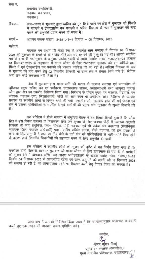 पौड़ी गढ़वाल के गजल्डा गांव में 4 दिसम्बर 2025 को गुलदार के हमले में 42 वर्षीय राजेंद्र नौटियाल की मौत के बाद पैदा हुए जनाक्रोश के बीच वन विभाग ने बड़ा कदम उठाया है। मानव जीवन के लिए खतरा बन चुके इस गुलदार को पकड़ने-मारने के लिए अब दो अनुभवी स्थानीय शिकारियों को औपचारिक अनुमति दे दी गई है।