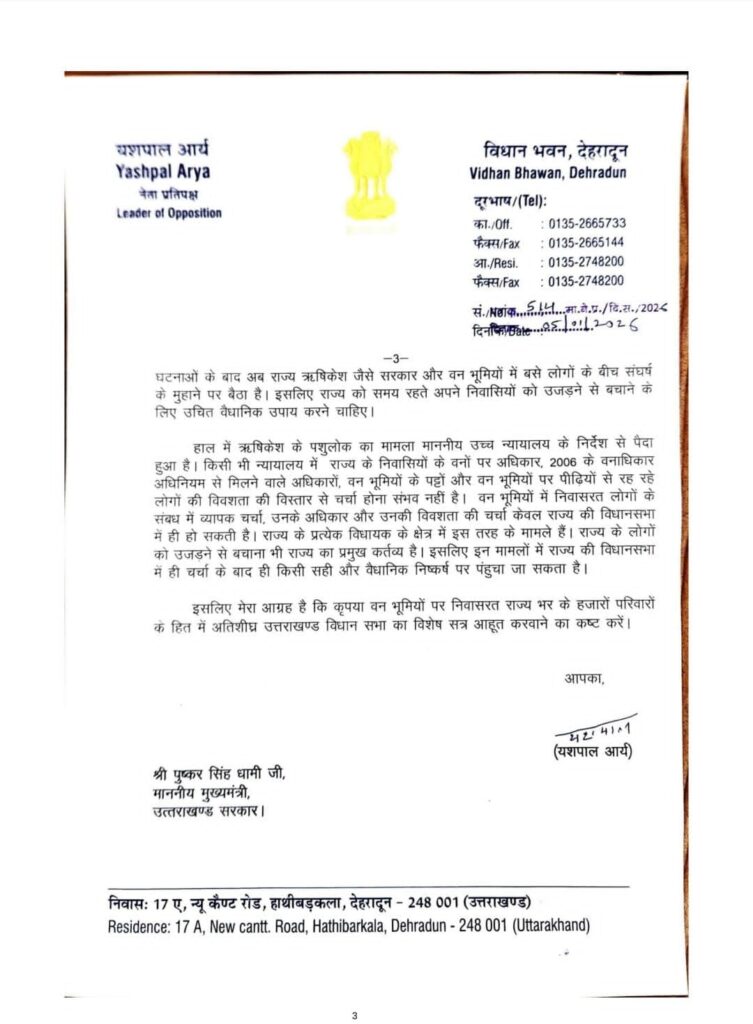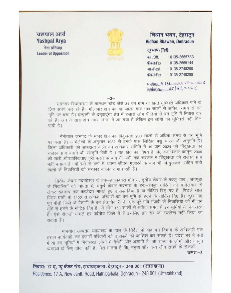 उत्तराखंड में वन भूमि पर कब्जे के मामलों को लेकर बढ़ते विवाद के बीच नेता प्रतिपक्ष यशपाल आर्य ने मुख्यमंत्री को पत्र लिखकर प्रदेश भर के हजारों परिवारों के हित में विधानसभा का विशेष सत्र बुलाने की मांग की है। पत्र में ऋषिकेश के पशुलोक क्षेत्र की 2866 एकड़ वन भूमि के मामले का जिक्र करते हुए कहा गया है कि सुप्रीम कोर्ट के 22 दिसंबर 2025 के कड़े निर्देशों से क्षेत्र में अफरा-तफरी मच गई है और हजारों परिवारों में बेचैनी फैल गई है।